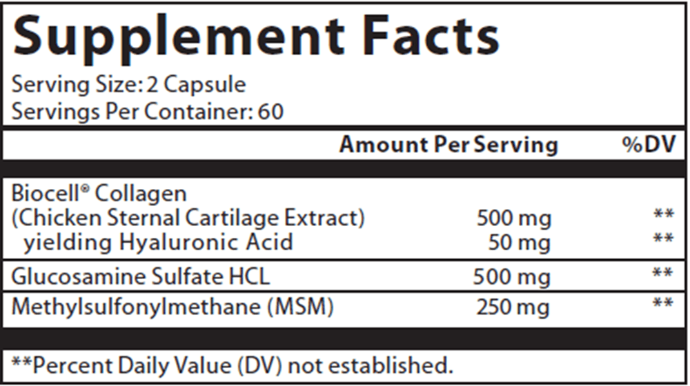 BioCell Type II Collagen Matrix consists of Collagen, Hyaluronic acid in a patented delivery system utilizing a low molecular weight H.A. (less than 30,000 daltons) for optimal utilization by the body and chondroitin sulfate. 60 mg of H.A. per serving.