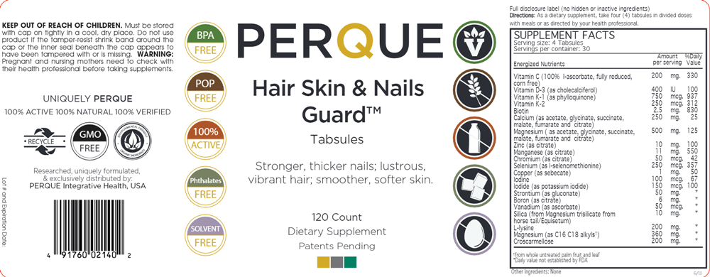 PERQUE Hair, Skin, & Nails Guard™ restores and strengthens your health from within for the fullest hair, most youthful skin and strongest nails. Feel and see the difference that maximum potency, purity and bioavailability can make. PERQUE Hair, Skin, & Nails Guard™ is the most active, complete and advanced nutrient complex to reveal your most radiant beauty.