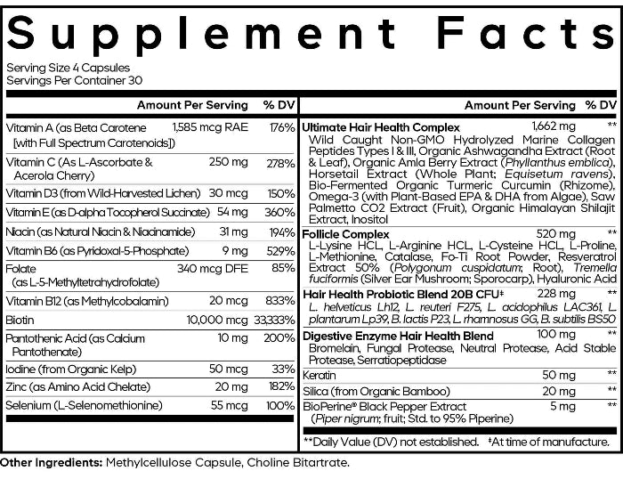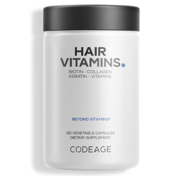 Codeage Hair Vitamins is a premium, unique and all-in-one hair supplement formula which combines biotin, keratin, collagen, vitamins, probiotics, hyaluronic acid, enzymes and minerals all at once! This special hair formula contains 10,000 mcg of biotin, hydrolyzed collagen of type 1 & 3, keratin, omega-3, vitamin A, vitamin B (B6 & B12), vitamin C, D3 and E, pantothenic acid, folate, iodine, selenium, BioPerine, niacin, organic turmeric curcumin, organic ashwagandha, saw palmetto, silver ear mushroom, zinc and more!