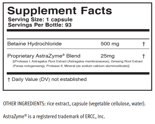 HCL-XYM™ Digestive Catalysts is a blend of betaine hydrochloride and the three most effective plant-based digestive enzymes: protease, amylase and lipase in a base of trace minerals.