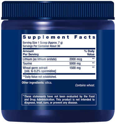 Healthy Aging Powder is a multi-nutrient formula for those seeking to support a healthy lifespan. It encourages overall cardiovascular health, mood support and cognitive function. This easily mixable, non-flavored powder contains three ingredients: 2,000 mcg (2 mg) of lithium, 5,000 mg of taurine and 1,500 mg of wheat germ extract standardized to spermidine. Each unit contains a 30-day supply. Like many Life Extension supplements, Healthy Aging Powder is made with 100% non-GMO ingredients.