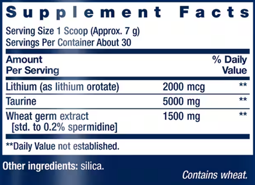 To age healthfully, you need a healthy heart, sharp mind and active body. This powder features a triple-nutrient blend of taurine, lithium and spermidine from wheat germ extract. This combination is formulated to offer support for cardiovascular health, mood support, healthy cognitive function—and overall healthy aging.