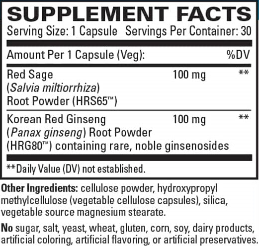 Healthy Circulation* with HRS65™ Red Sage and HRG80™ Red Ginseng. Two Botanicals for Outstanding Cardio Support* Red sage and red ginseng support similar functions in the cardiovascular system—sometimes working through similar pathways and sometimes through pathways unique to each herb. Most importantly, they bring both combined and individual strengths to Healthy Circulation.*