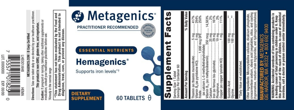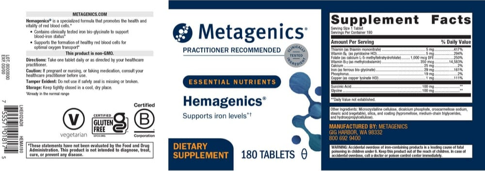 Hemagenics® is a comprehensive supplement designed to support blood health. Its highly specialized formula blends iron, succinic acid, glycine, folate, and vitamins B6 and B12 to support the formation and maintenance of healthy red blood cells.*