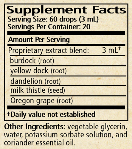 Ingredients: Milk thistle, dandelion, burdock, Oregon grape, yellow dock, essential oil of coriander, and potassium sorbate (0.1%) in a base of vegetable glycerin and spring water.