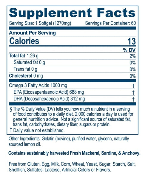 Our fish oil contains concentrated EPA and DHA for a truly potent single capsule dosage. Each softgel provides 750mg of EPA and 250mg of DHA. It is sourced from a sustainable Alaskan fishery, which is MSC-certified since April 2005 and has been responsibly managed for over 30 years. Molecularly distilled, our fish oil exceeds industry standards for purity. The full spectrum of laboratory testing meets and exceeds GOED Voluntary Monograph for Omega-3s.