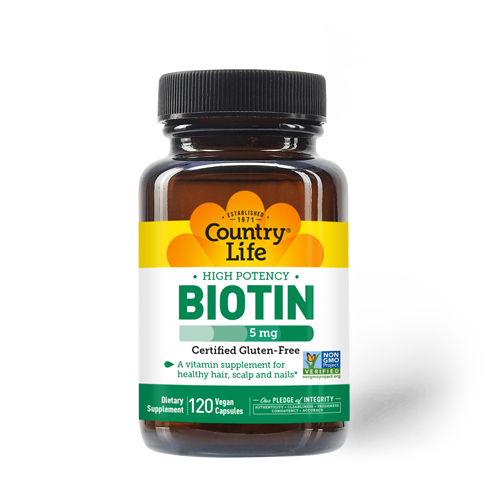 Biotin is a water soluble B Vitamin that supports the formation of keratin, a building block for hair, scalp, skin and nails. Biotin also supports energy metabolism. Country Life’s High Potency Biotin is also available in 10,000 mcg (10 mg).