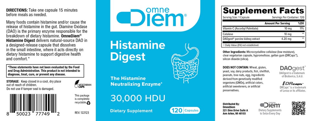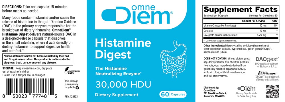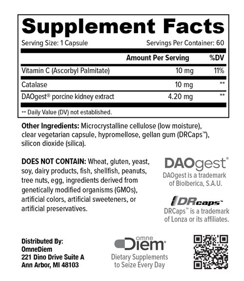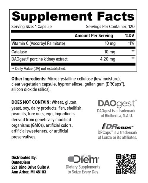 Many foods contain histamine and/or cause the release of histamine in the gut. Diamine Oxidase (DAO) is the primary enzyme responsible for the breakdown of dietary histamine. Diem Histamine Digest delivers natural- source DAO in a designed-release capsule that dissolves in the small intestine, where it acts directly on dietary histamine to support digestive health and comfort.*