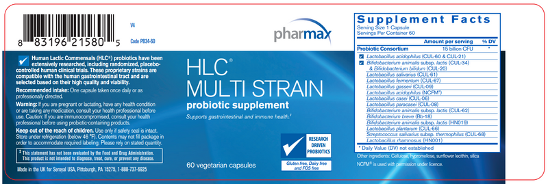 HLC Multi Strain is a 15 billion CFU probiotic formula, providing four strains of proprietary, human-sourced Lactobacillus acidophilus, Bifidobacterium bifidum and Bifidobacterium animalis subsp. lactis that supports a healthy gut microflora. The intestinal microbiota, which contains more than 400 bacterial species, can be altered by aging, or impacted by premature or caesarean birth. The intestines are a critical barrier that selectively allow absorption or promote the excretion of compounds, and their optimal function depends on a healthy microbiome. The most commonly used probiotics are Lactobacilli and Bifidobacteria. They effectively colonize the intestines, but after ingestion ends, their counts decline. Probiotics also reinforce the epithelial barrier, and they control permeability by mediating tight junction integrity.