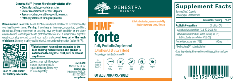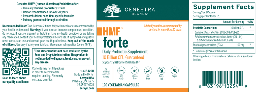 HMF Forte is a unique combination of four strains of proprietary, human-sourced probiotics that helps to promote gastrointestinal health in adults and children. Supplementation with large numbers of a combination of microorganisms will help maximize intestinal colonization, supporting the growth of beneficial bacteria. Lactobacilli and Bifidobacteria, the most commonly used probiotics, help colonize the intestines and mediate the permeability of epithelial cells. In a randomized, placebo-controlled trial involving 22 adults, daily supplementation with a probiotic containing Lactobacillus acidophilus supported a healthy microflora balance.