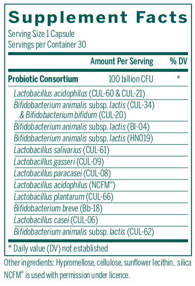 HMF Multi Strain 100 capsules offer 100 billion CFU from a combination of 14 probiotic strains. Included in this blend of proprietary, human-sourced probiotics are eight strains of Lactobacilli and six strains of Bifidobacteria to ensure colonization in both the small and large intestines. These research-driven strains were selected based on their superior adherence to the gut lining, natural resistance to pH and bile acid, and ability to support gastrointestinal health and promote a favorable gut flora. One recent placebo-controlled trial found that daily supplementation with Bifidobacterium animalis subsp. lactis (HN019), a probiotic strain found in HMF Multi Strain 100, promoted healthy intestinal transit time and reduced occasional constipation. HMF Multi Strain 100 also contains BL-04 and NCFM™ to support immune health. In addition, supplementation with a combination of CUL-60, CUL-21, CUL-34 and CUL-20 (plus vitamin C) was found to promote healthy immune responses in schoolchildren.