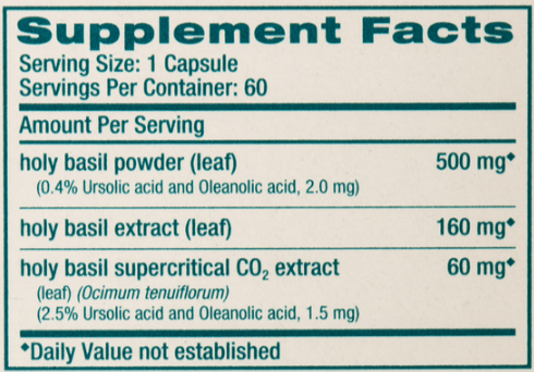 Himalaya Holy Basil uses a combination of Holy Basil leaf powder, Holy Basil leaf extract and Holy Basil supercritical C02 leaf extract instead of just the simple crushed Holy Basil you may find on its own in other supplements.*