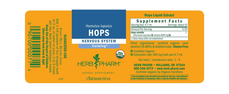 Herb Pharm prepares Hops extract from the lupulin-rich strobile (female flower) of Certified Organic Humulus lupulus vines. Hops is a vine that vigorously grows on trellises. We work with Pearl and Cascade varietals.