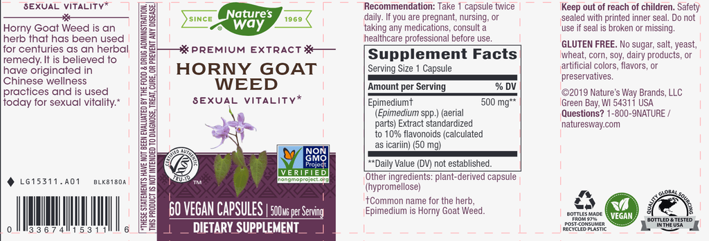 Heat things up with Nature’s Way Horny Goat Weed, which promotes sexual vitality.* Horny goat weed (“ying yang huo” in Chinese) is a flowering plant with purple-pink blossoms that has been used for centuries as an herbal remedy and is thought to have originated in ancient Chinese wellness practices.