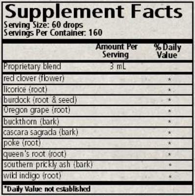 Ingredients: Red clover, licorice, burdock, Oregon grape, buckthorn, cascara sagrada, poke, Queen's root, Southern prickly ash, wild indigo and 5% solution of potassium iodide in a base of organic cane alcohol, mountain spring water and vegetable glycerine.