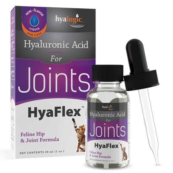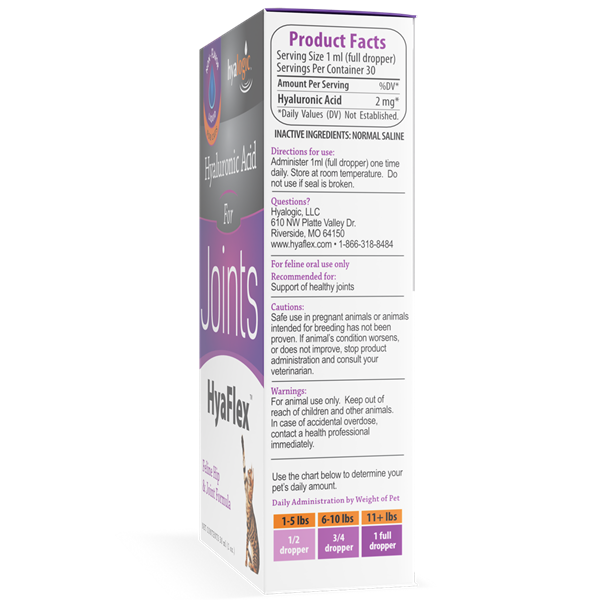 HyaFlex™ for Cats is a liquid high molecular weight HA for oral use. This patented feline formula supports your cat’s healthy joint and cartilage function. It contains no preservatives and is odorless, tasteless and colorless. (30 ml)