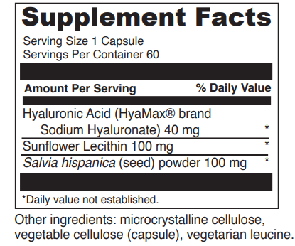 Hyaluronic Acid Capsules are designed to support healthy skin and joints by helping to hydrate, support healthy collagen, and thicken the synovial fluid.* It combines low molecular (less than 30,000 daltons) weight hyaluronic acid with Chia and lecithin for maximum bioavailability. Hyaluronic Acid is an excellent adjunct to any program designed to support joint, skin and connective tissue health.*
