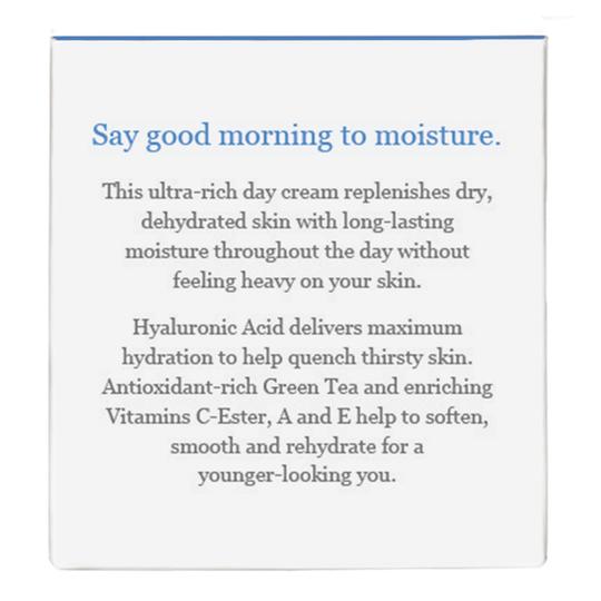 The key ingredient is Hyaluronic Acid, an intense moisturizer that quenches thirsty skin so it feels soft and smooth throughout the day. Hydrating Day Cream is formulated with a powerful combination of all-natural ingredients that nourish and protect your complexion. Dry, dehydrated skin is revived with maximum moisture with our face cream, and the lightweight, silky texture won’t feel heavy or greasy on your skin.