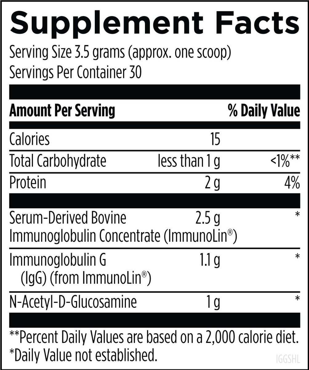 These ingredients work together to provide support to the intestinal barrier and to support gut immune health.* ImmunoLin®, a serum-derived bovine immunoglobulin concentrate (SBI), is the only purified, dairy-free source of immunoglobulin G (IgG) available as a dietary supplement. Immunoglobulins play an integral role in the support of healthy immune function at the gut and systemic levels.* N-acetyl-D-glucosamine promotes healthy immune function by promoting a balanced immune response.*
