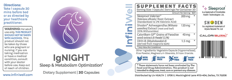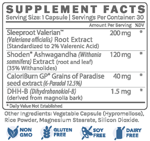 IgNIGHT provides unparalleled restorative sleep support with the industry first combination of Sleeproot Valerian™, the most potent forms of Valerian available. Ignight also features ShodenⓇ Ashwagandha, a proven powerhouse to balancing circadian rhythm and providing hormonal support, DHH-B, a mood support derived from magnolia bark, and CalorieBurn GP®, a metabolic and weight management support derived from the clinically-studied grains of paradise.