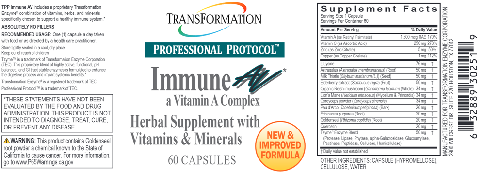 Transformation’s Professional Protocol™ Immune AV: a Vitamin A Complex is an herbal supplement with vitamins and minerals specifically chosen to support a healthy immune system plus enzymes for improved delivery.