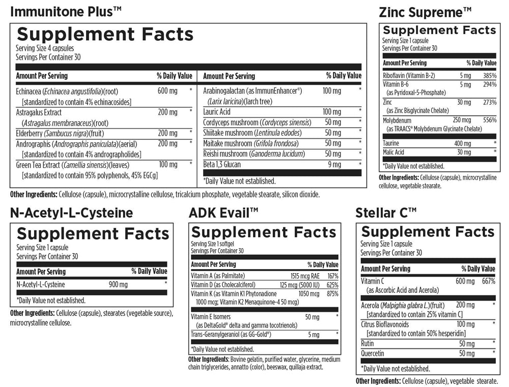 Immune Support Packets offer five distinct, supportive formulations for the immune system in one convenient packet. The combined ingredients provide antioxidants, medicinal mushrooms, zinc, vitamin D, vitamin B6, and other nutrients and botanical compounds to promote a healthy immune response and balance.*
