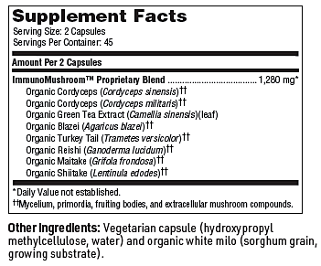 Ther-Biotic® ImmunoMushroom™ supports immune health with a blend of highly researched and effectively concentrated mushroom extracts combined with the polyphenol nutrient support of green tea. This powerful combination supports your natural immune function with the power of beta-glucans, digestive enzymes, prebiotics, antioxidants, and other important nutrients.† Grown in the USA under rigidly controlled conditions, these mushroom extracts are made with 100% certified organic ingredients.