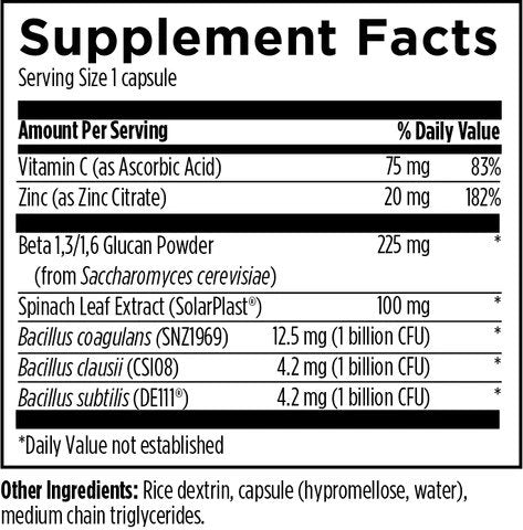 ImmunoSpore™ is a synergistic combination of spore-based probiotics and antioxidants to support natural immune system health and overall well-being.* It features 3 billion CFU spore-based probiotics (three industry-leading Bacillus strains), along with a highly concentrated chloroplast extract from organic spinach, vitamin C, zinc, and the soluble fiber beta-glucan. The well-studied ingredients in ImmunoSpore™ provide comprehensive support for optimal immune health and a normal inflammatory response.*