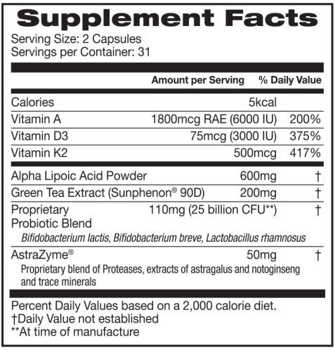 Immunoxym contains nutritional amounts of: Vitamin A, Vitamin D3, Vitamin K, ALA, Green Tea Extract, and 25 Billion CFU of Bifidobacterium breve and lactis and Lactobacilus rhamnosus.