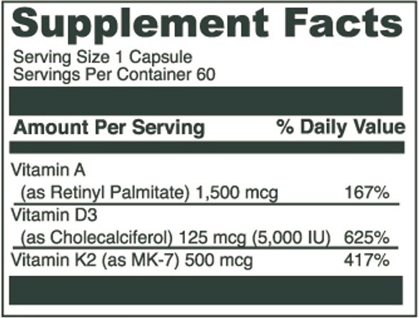 Suggested Use: Take 1 capsule of Vitamin A D K Complete with food per day. Do not exceed more than 2 capsules in a 24 hour period.