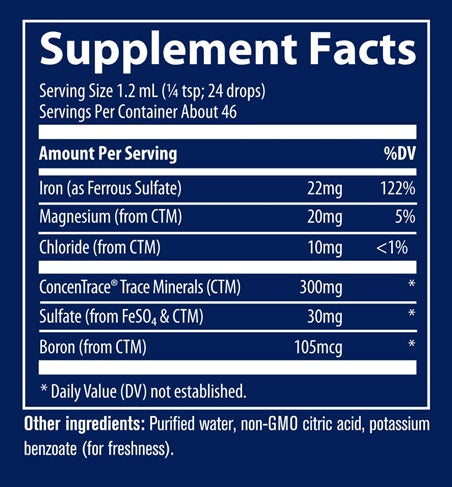Liquid Ionic Iron is an essential mineral for optimal health. Research indicates that it plays an important role in proper enzyme and cognitive function, energy production, and optimal immune system function.* 46-day supply, 22mg/serving of Iron Sulfate.