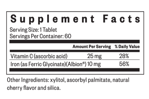 Iron Chewable by Seeking Health provides well-tolerated, well-absorbed iron as ferric glycinate, along with vitamin C to support optimal iron absorption. Iron is a mineral that the body needs for healthy growth and development. The body uses iron to make hemoglobin, a protein in red blood cells that carries oxygen from the lungs to all parts of the body, and myoglobin, a protein that provides oxygen to muscles. Iron is also important for normal synthesis of certain hormones and maintaining healthy connective tissues.*