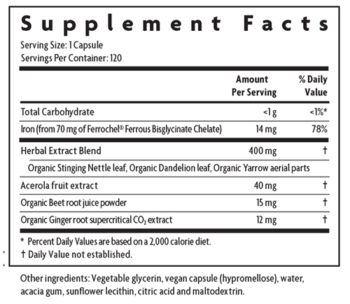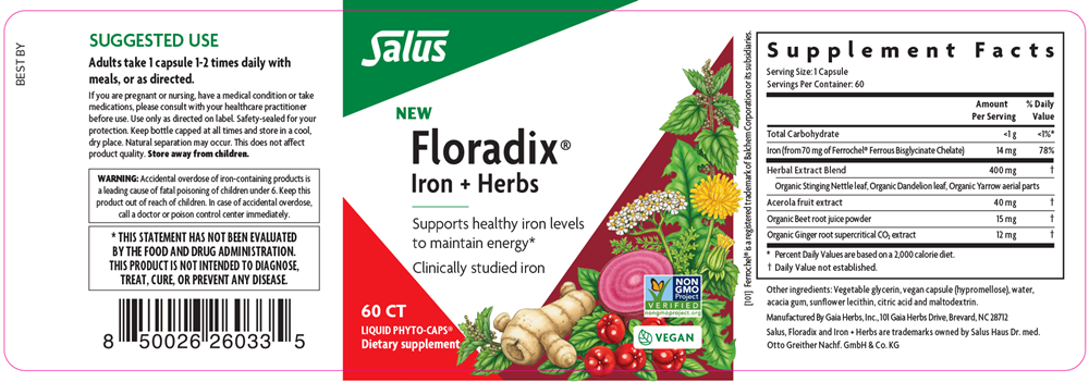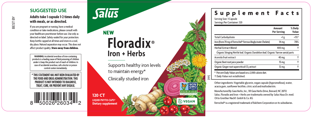 Supports healthy iron levels to maintain energy* This Floradix Iron + Herbs extension is different from other iron offerings as it combines a clinically studied iron form, Ferrochel®, in a liquid phyto-capsule along with herbs traditionally used to support healthy blood and blood flow. * These phyto-capsules are a convenient form of the best-selling Floradix® Iron + Herbs. This is a non-constipating formula, perfect for traveling.* With clinically studied Ferrochel® iron, known to be more bioavailable and cause less gastric upset* Supports the body's formation of red blood cells Herbal extract with high absorption chelated iron.