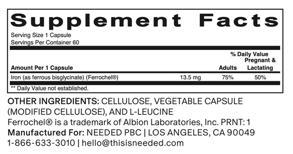 Needed's Iron is in a bioavailable and well tolerated form, supports optimal iron levels for perinatal and women's health.