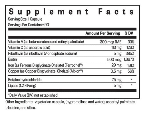 Optimal Iron is designed for those who need effective iron support, but are sensitive to most iron supplements. This gentle iron complex contains targeted nutrients that facilitate the absorption of iron.† Many people struggle to absorb iron from whole foods and supplements. Iron requires supporting cofactor nutrients for its efficient absorption, transport, and utilization in the body. Low levels of these make it challenging to increase iron levels even with supplementation.†