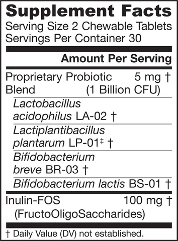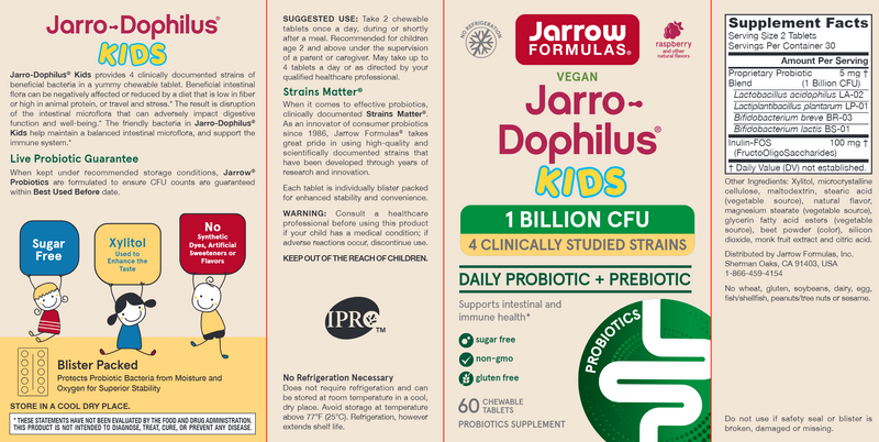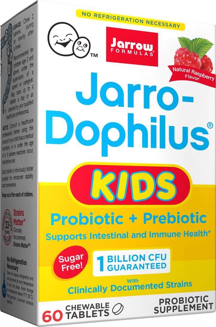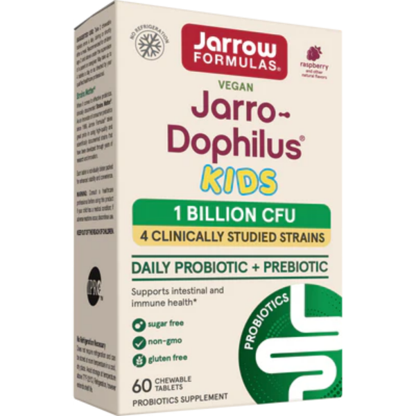 Jarro-Dophilus® Kids provides 4 clinically documented strains of beneficial bacteria in a yummy chewable tablet. Beneficial intestinal flora can be negatively affected or reduced by a diet that is low in fiber, high in animal protein, the use of medications, travel and stress, etc. The result is disruption of the intestinal microflora, which can negatively affect gastrointestinal function and well being. The friendly bacteria in Jarro-Dophilus® Kids help maintain a balanced intestinal microflora, support immune function and promote health.