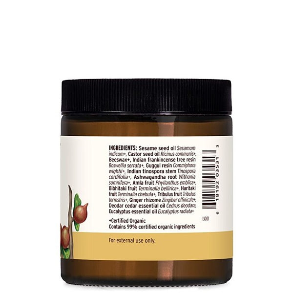 Each 4oz jar contains: Sesame Oil (Sesamum indicum)+, Castor Oil (Ricinus communis)+, Beeswax+, Boswellia (Indian Frankincense tree) resin (Boswellia serrata)+, Guggulu (Guggul) resin (Commiphora wightii)+, Guduchi (Indian Tinospora) stem (Tinospora cordifolia)+, Ashwagandha root (Withania somnifera)+, Amla fruit (Phyllanthus emblica)+, Bibhitaki fruit (Terminalia bellirica)+, Haritaki fruit (Terminalia chebula)+, Gokshura (Tribulus) fruit (Tribulus terrestris)+, Ginger rhizome (Zingiber officinale)+, Deodar cedar essential oil (Cedrus deodara), Eucalyptus essential oil (Eucalyptus radiata)+.