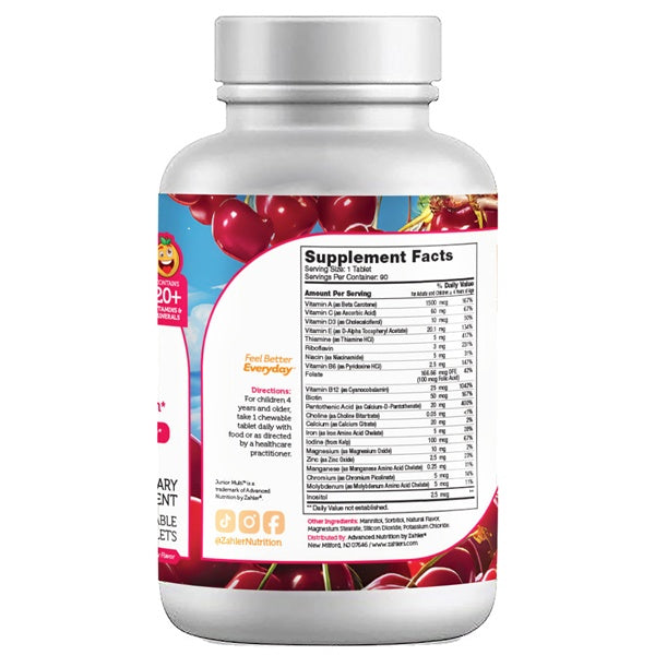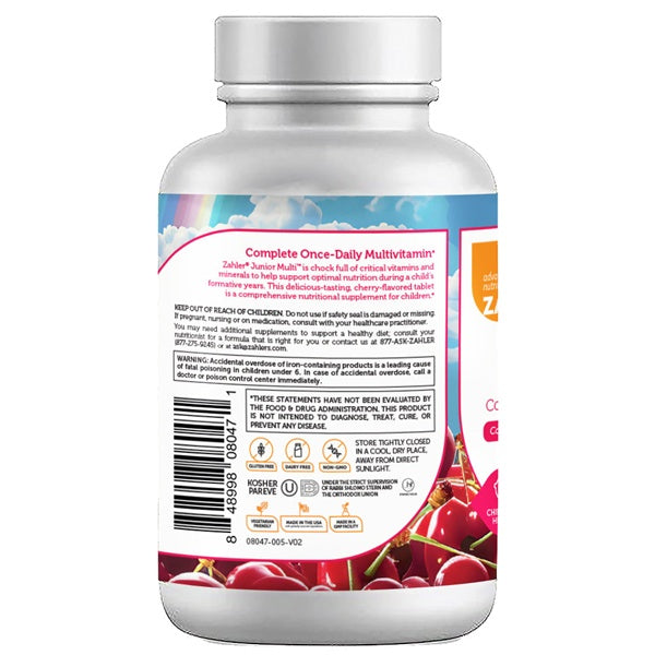 Zahler's Junior Multi is a children's multivitamin chock full of critical vitamins and minerals, recommended by today’s leading researchers, to fill in the gaps of the most prevalent nutritional deficiencies. Because nutritional deficits that occur during a child’s formative years have both immediate and lifelong consequences, Junior Multi contains the right combination of 23 essential nutrients in a delicious-tasting, all natural cherry-flavored tablet. It gives growing children the nutritional boost they need to maintain a healthy mind and body.