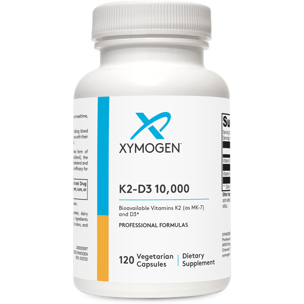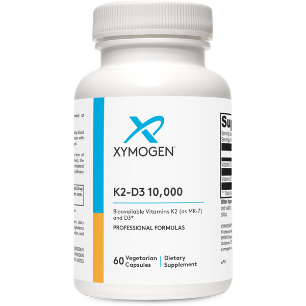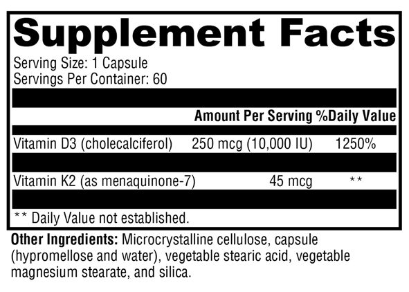 K2-D3 10,000 features the most bioavailable and bioactive form of supplemental vitamin K2 available and vitamin D3 (cholecalciferol), the identical form in which vitamin D is derived in the body from cholesterol and synthesized by sunlight on the skin. Studies confirm safety and efficacy for bone and heart health.*
