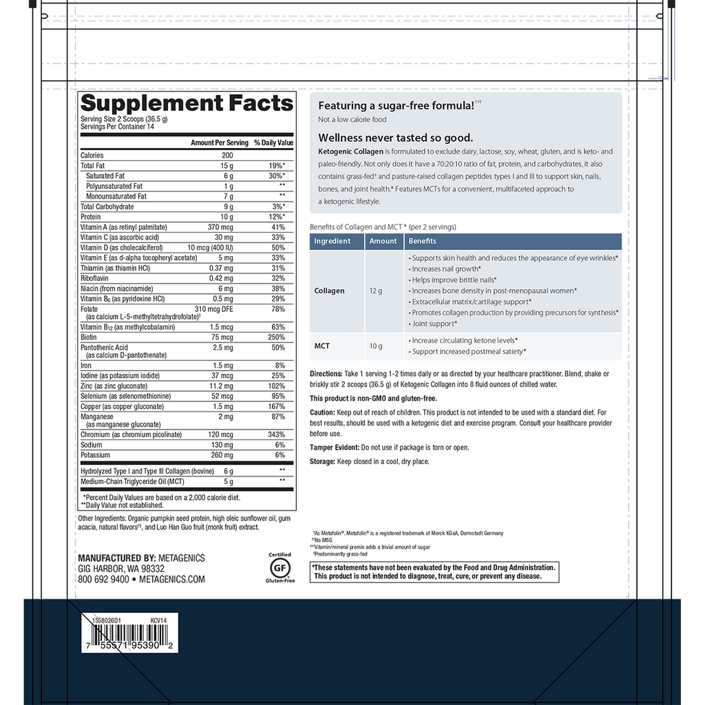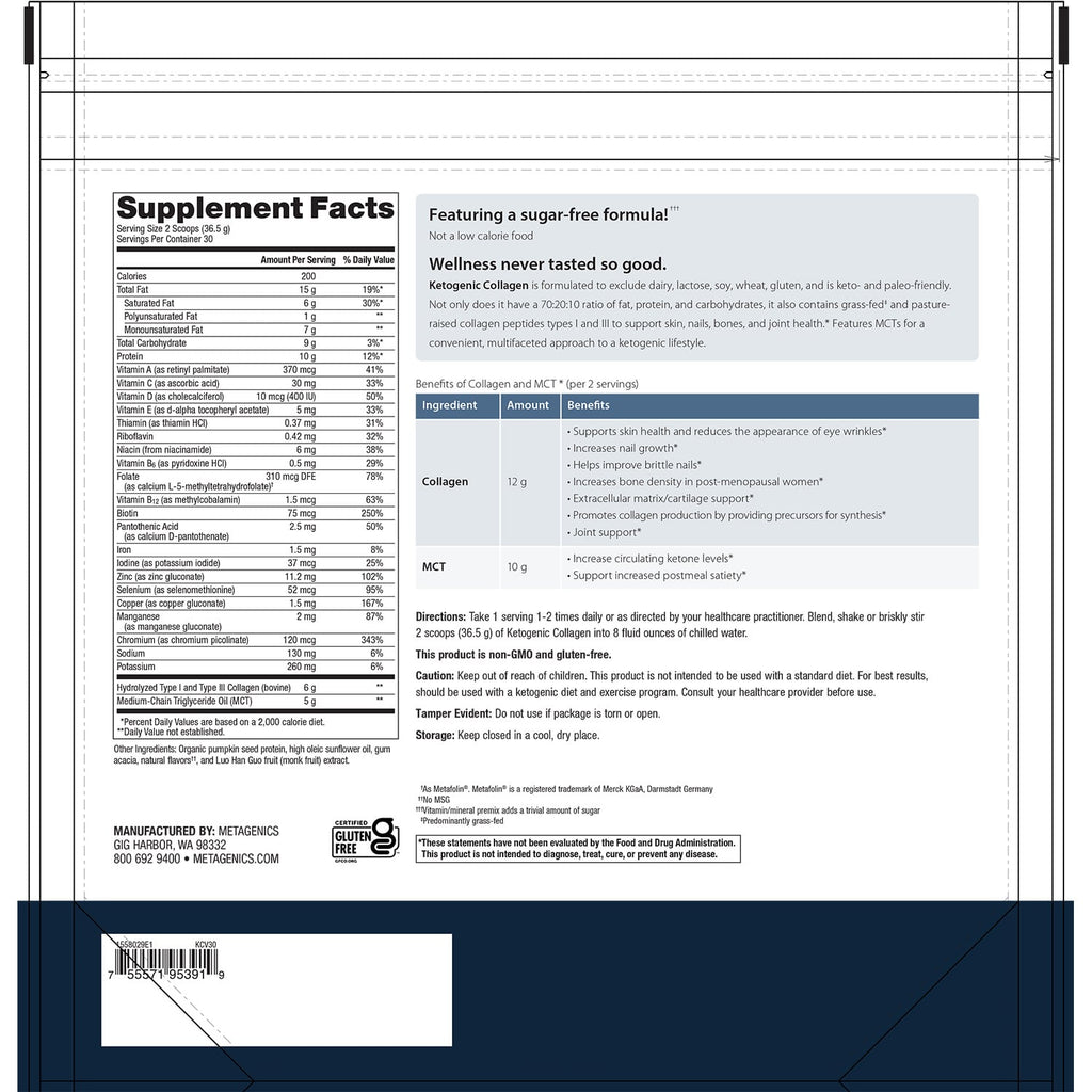 Take 1 serving 1-2 times daily or as directed by your healthcare practitioner. Blend, shake or briskly stir 2 scoops (36.5 g) of Ketogenic Collagen into 8 fluid ounces of chilled water.