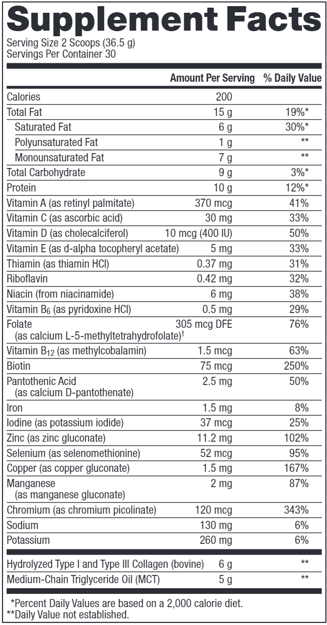 Ketogenic Collagen is formulated to exclude dairy, lactose, soy, wheat, gluten, and is keto- and paleo-friendly. Not only does it have a 70:20:10 ratio of fat, protein, and carbohydrates, it also contains grass-fed‡‡ and pasture-raised collagen peptides types I and III to support skin, nails, bones, and joint health.* Features MCTs for a convenient, multifaceted approach to a ketogenic lifestyle.