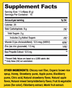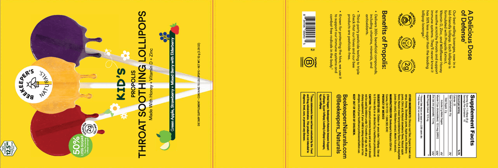 Beekeeper's best-selling lozenges, now in a kid-friendly lollipop. Each lollipop is formulated with Propolis Extract, Vitamin D, Zinc, and Wildflower Honey to soothe scratchy throats and support immune systems. They'll never know it has 50% less sugar than the leading lollipop lozenge.*