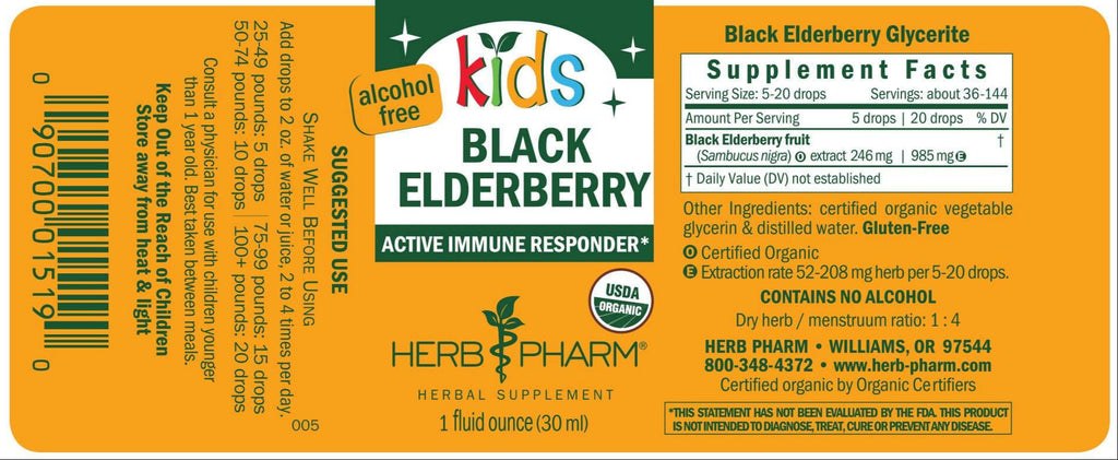 Kids’ Black Elderberry Glycerite is prepared from the ripe berries of Certified Organic Sambucus nigra trees. To assure optimal extraction of the herbs bioactive compounds, the berries are hand-harvested only when ripe.