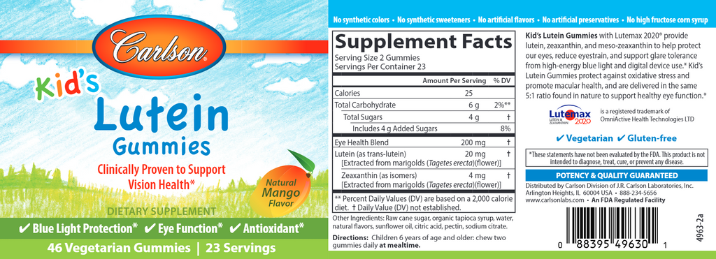 Kid's Lutein Gummies are specially formulated with Lutemax 2020®, which provides lutein, zeaxanthin (RR-zeaxanthin), and meso-zeaxanthin (RS-zeaxanthin) - three carotenoids that serve as powerful antioxidants and are clinically proven to support eye health by filtering high-energy blue light from digital devices and indoor/outdoor light. Lutein Gummies reduce eyestrain from digital device use, support glare tolerance while using digital devices, protect against oxidative stress, and promote healthy eye function. Lutemax 2020® is derived from sustainably grown, GMO-free marigolds and delivers lutein and zeaxanthin in the same 5:1 ratio found in nature to support healthy eye function. Support your family's vision health with Carlson natural mango flavored Lutein Gummies. Lutein Gummies contain no synthetic sweeteners, no artificial flavors, no artificial preservatives, and no high-fructose corn syrup.