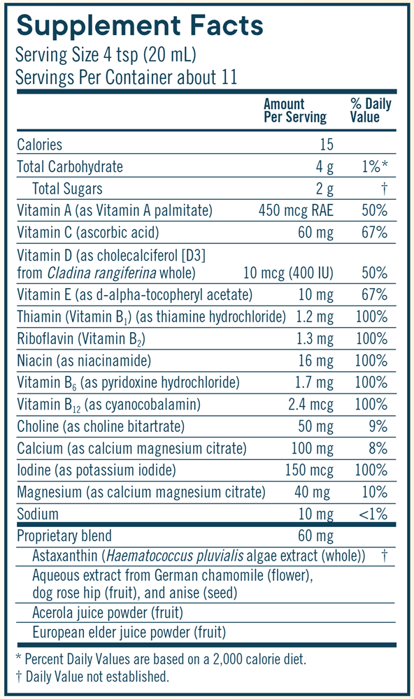 Adults and children 4 years and over: Shake bottle gently before use. Take 20 mL (4 tsp) daily with food, a few hours before or after taking other medications or supplements.