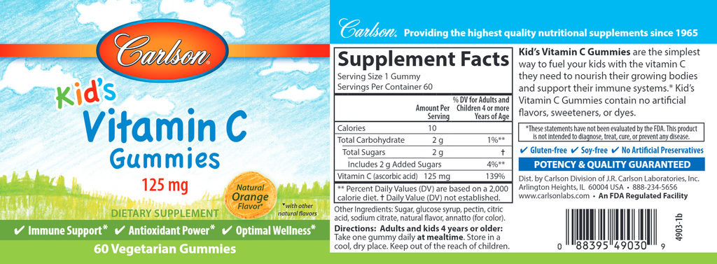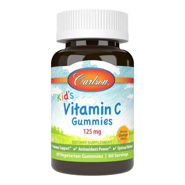 Kid's Vitamin C Gummies are the simplest way to fuel your kids with the vitamin C they need to nourish their growing bodies and to support their immune systems. Kid's Vitamin C Gummies provide 125 mg of vitamin C in each tangy orange wedge. Children can take one to two gummies daily, depending on their nutritional needs. Kid's Vitamin C Gummies are vegetarian and contain no artificial flavors, sweeteners, or dyes. Give your kids the antioxidant power of Carlson Kid's Vitamin C Gummies.
