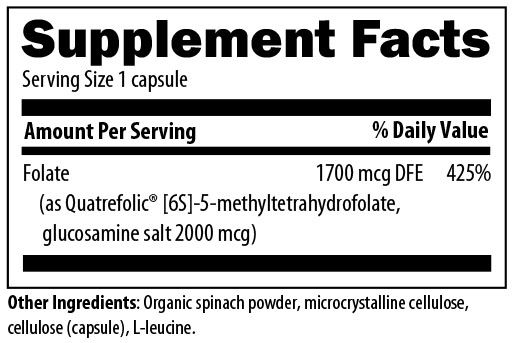 L-5-MTHF provides 1 mg (1,700 mcg DFE) of natural, biologically active form of folate, which is essential for cell division and growth, and also works to balance the homocysteine pathway.* This formula provides folate in the bioidentical, bioactive form, 5-methyltetrahydrofolate. In L-5-MTHF, the “L” signifies that it is an all-natural [6S] isomer, and this is the active circulating form of folate found in the body and one of the several forms found in food.