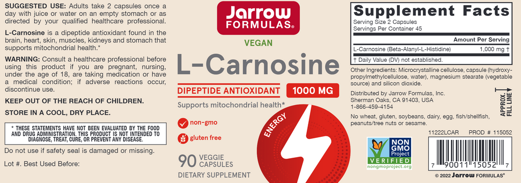 L-Carnosine is a dipeptide antioxidant found in the brain, heart, skin, muscles, kidneys and stomach that supports mitochondrial health.