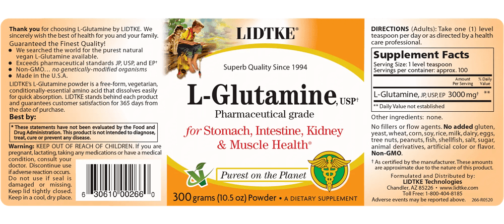 Lidtke®'s L-Glutamine powder is certified to be Vegan, allergen-free, non-GMO, and solvent-free.