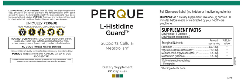 PERQUE L-Histidine Guard™ is an essential amino acid for gut and immune support. L-histidine supplementation can help restore optimum stomach acid production and in turn stimulate the secretion of gastric juices such as pepsin and hydrochloric acid.* L-histidine is a good source of stomach acid protons, which are often lacking in people with inherent digestive issues and those with allergies. L-histidine also has significant physiological antioxidant properties.